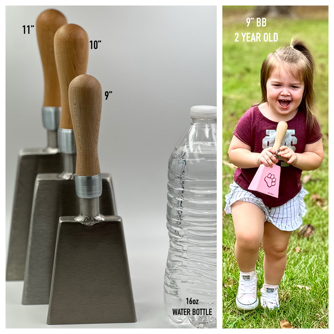 We offer 3 size BattleBells 9", 10", & 11". We are using a 16oz bottle of water & a 2 year old MSU fan holding the 9" BattleBell, for a reference.